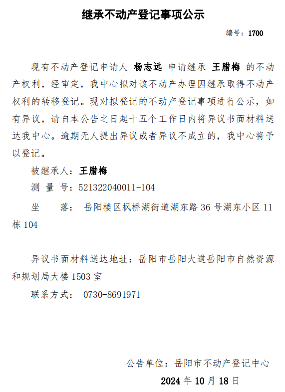 继承不动产登记公示 编号:杨志远(1700)