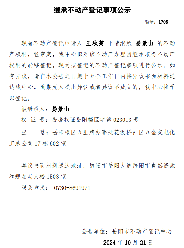继承不动产登记公示 编号:王秋菊(1706)