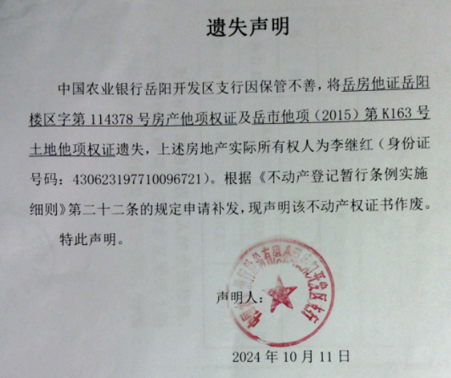 遗失声明(中国农业银行股份有限公司岳阳开发区支行)