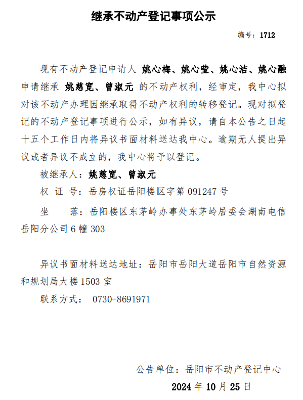 继承不动产登记公示 编号:姚心梅、姚心莹、姚心洁、姚心融(1712)