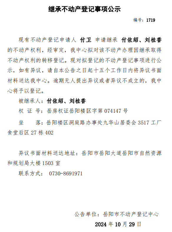 继承不动产登记公示 编号:付卫(1719)
