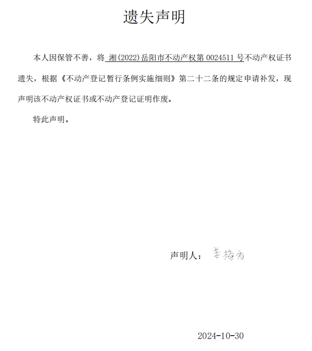 遗失声明(姜梅香 )