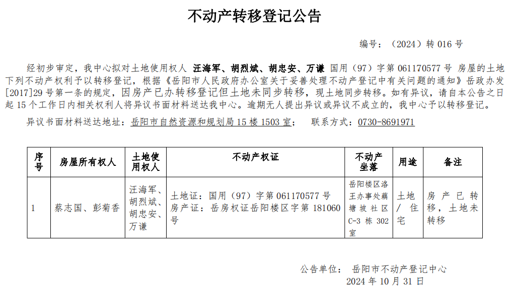 不动产转移登记公告 编号:汪海军、胡烈斌、胡忠安、万谦(2024)转016