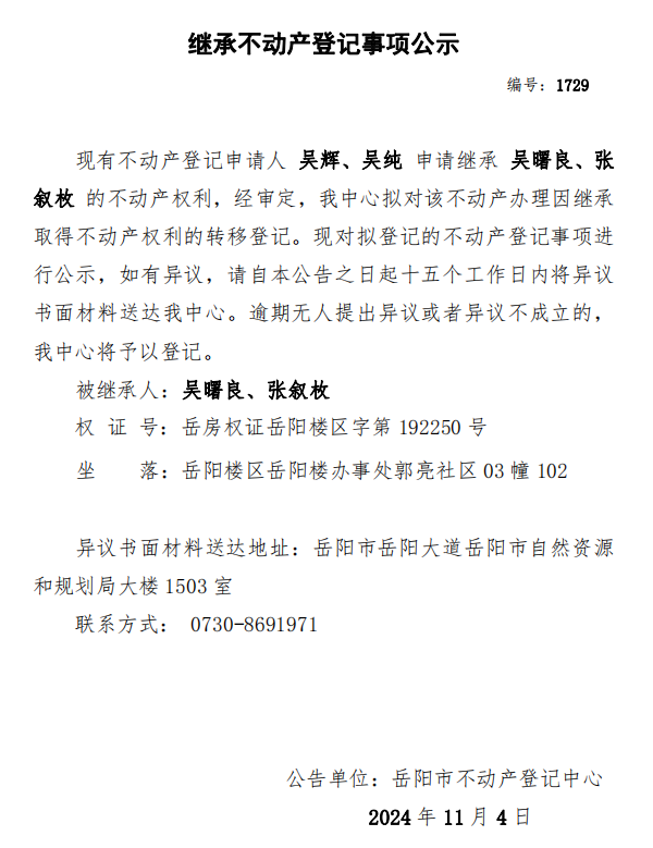 继承不动产登记公示 编号:吴辉、吴纯(1729)