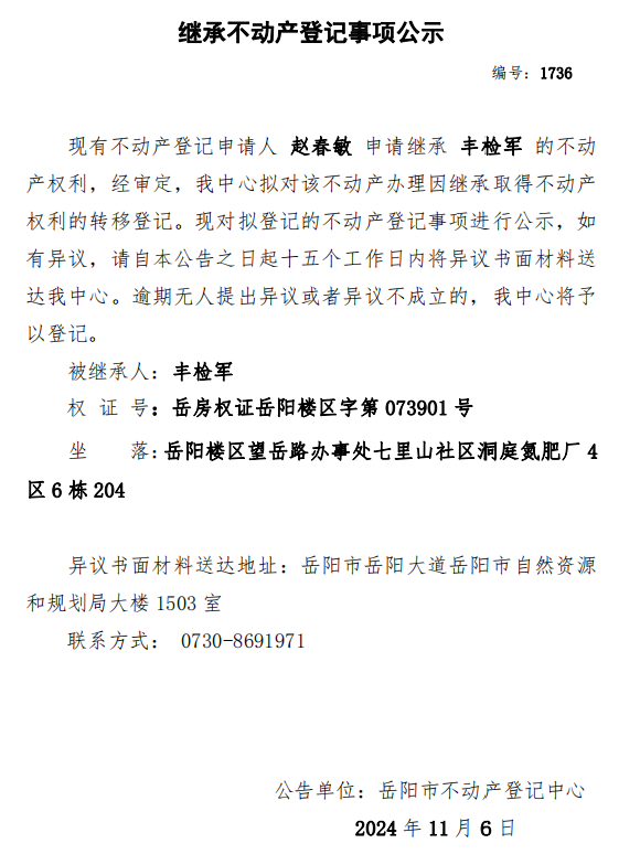 继承不动产登记公示 编号:赵春敏(1736)
