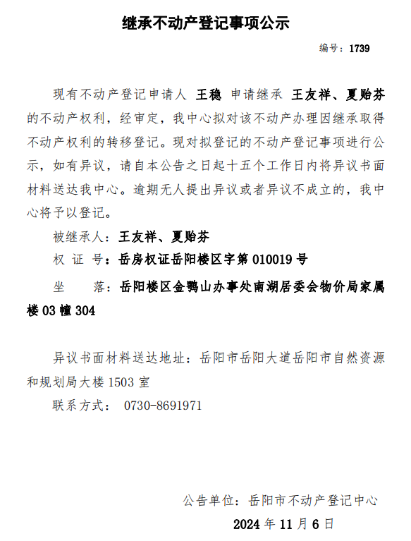继承不动产登记公示 编号:王稳(1739)