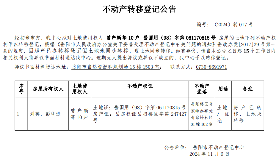 不动产转移登记公告 编号:曾产新等10户(2024)转017