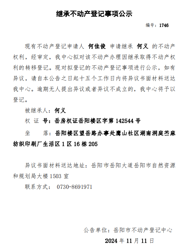 继承不动产登记公示 编号:何佳俊(1746)