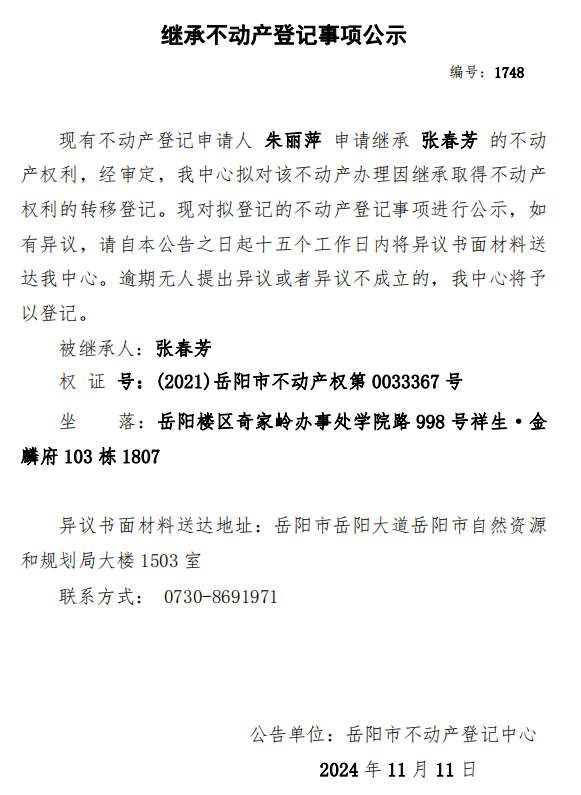 继承不动产登记公示 编号:朱丽萍(1748)