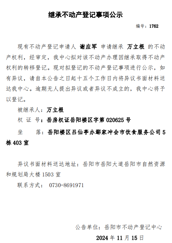继承不动产登记公示 编号:谢应军(1762)