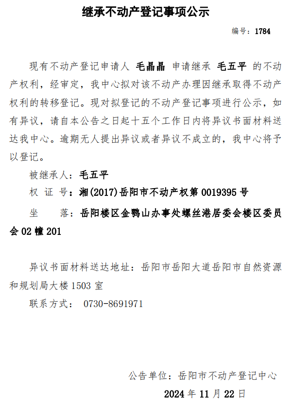 继承不动产登记公示 编号:毛晶晶(1784)