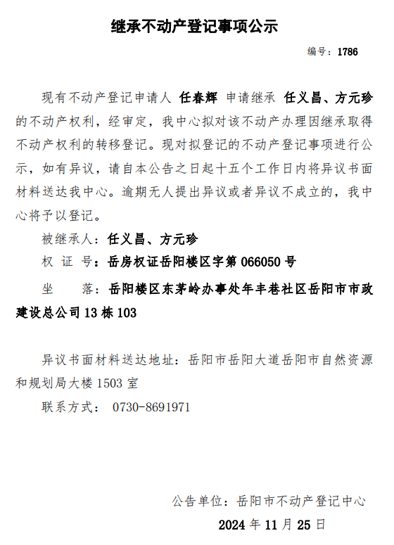继承不动产登记公示 编号:任春辉(1786)