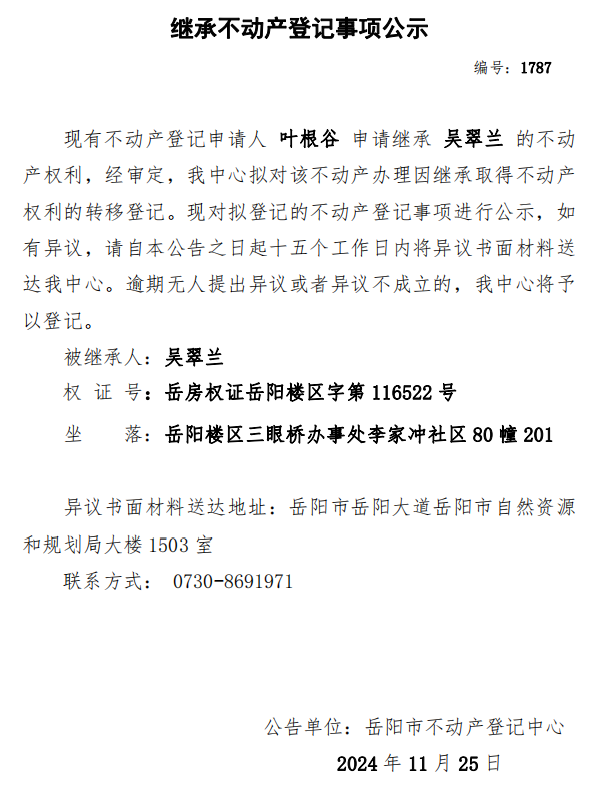 继承不动产登记公示 编号:叶根谷(1787)