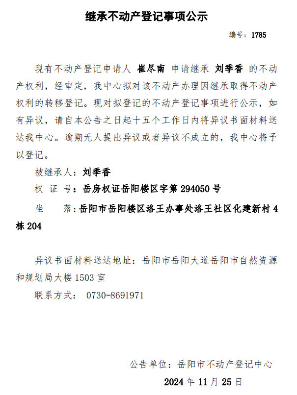 继承不动产登记公示 编号:崔尽南(1785)