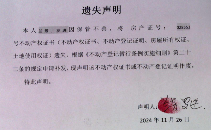遗失声明(兰芳、罗进 )