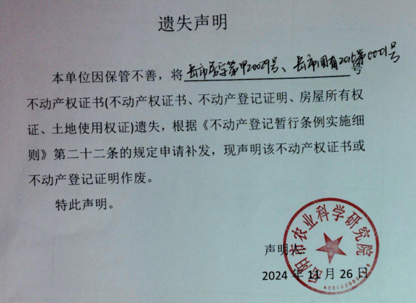 遗失声明( 岳阳市农业科学研究院)