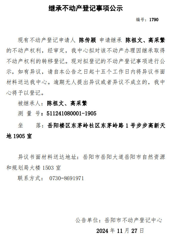 继承不动产登记公示 编号:陈传颖(1790)