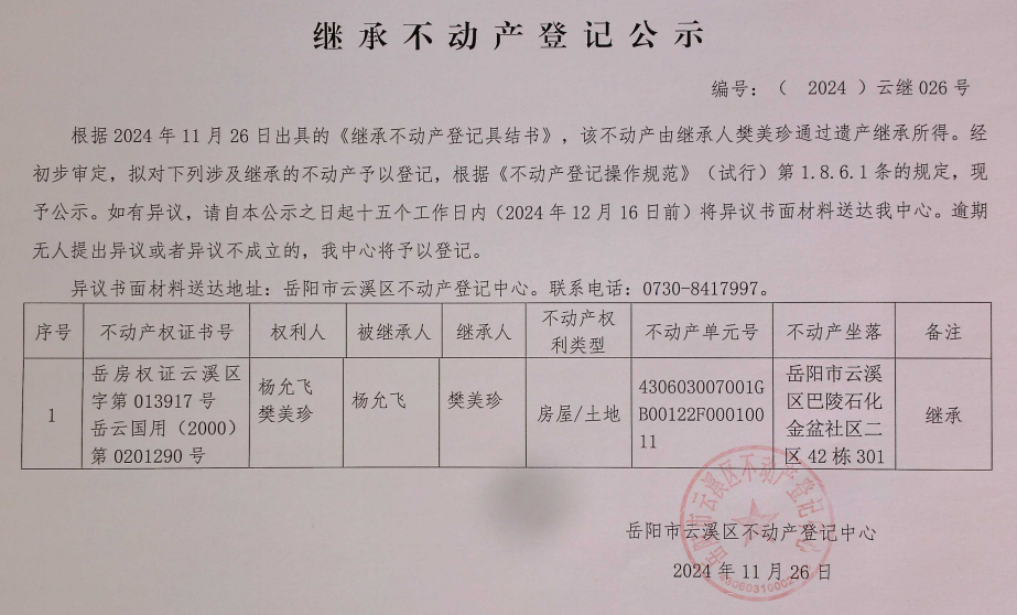 继承不动产登记公示 编号: (2024)云继026号