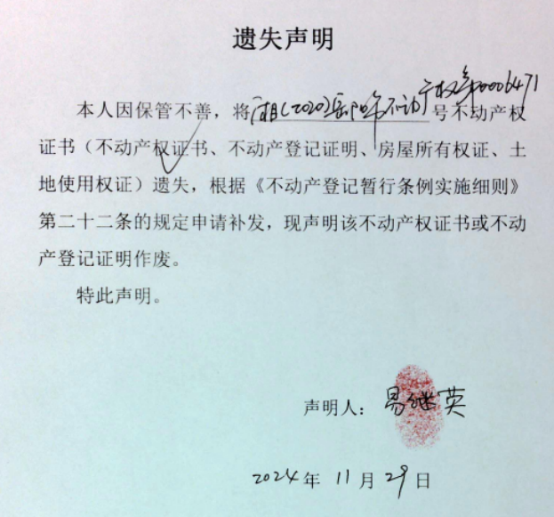 遗失声明(易继英 )