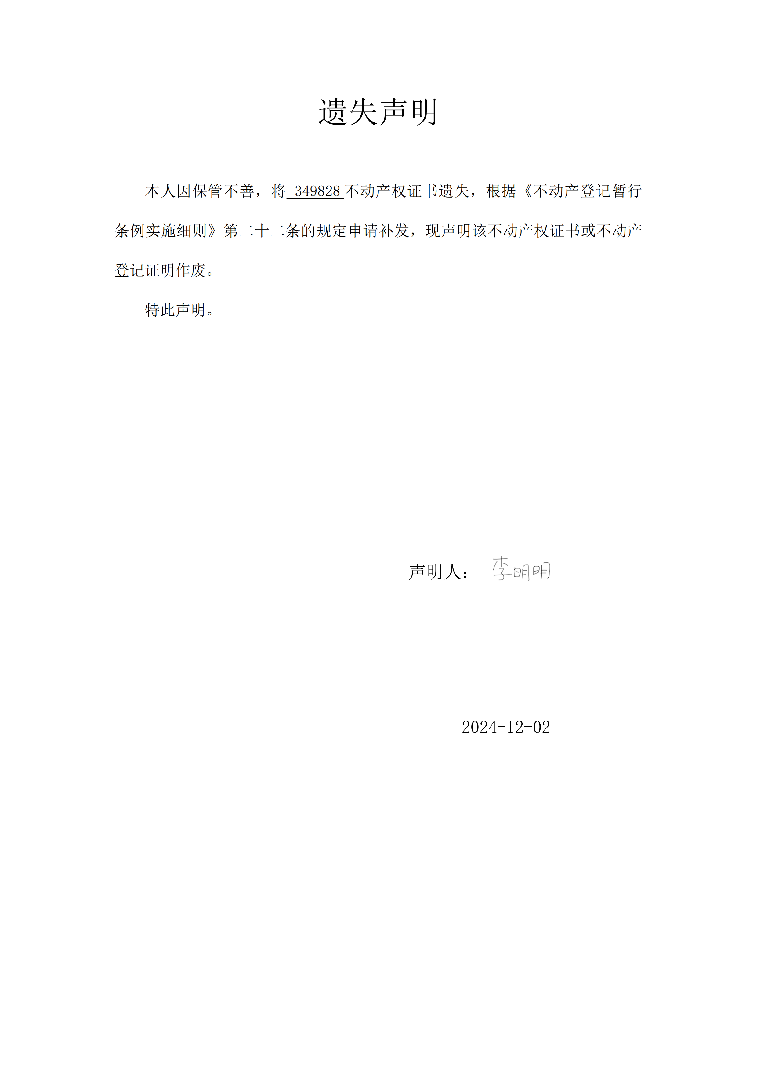 遗失声明(李明明)