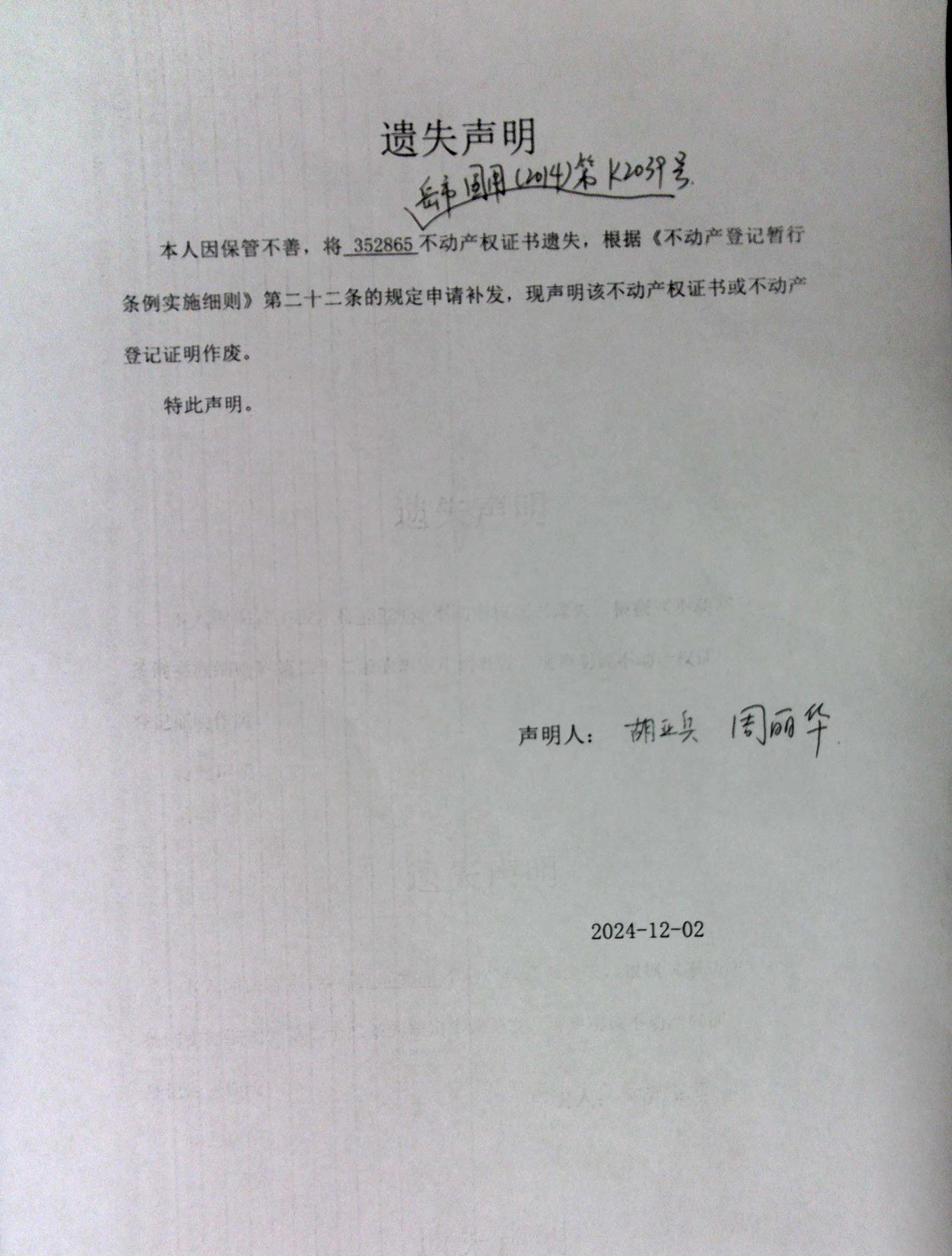 遗失声明(周丽华、胡亚兵 )