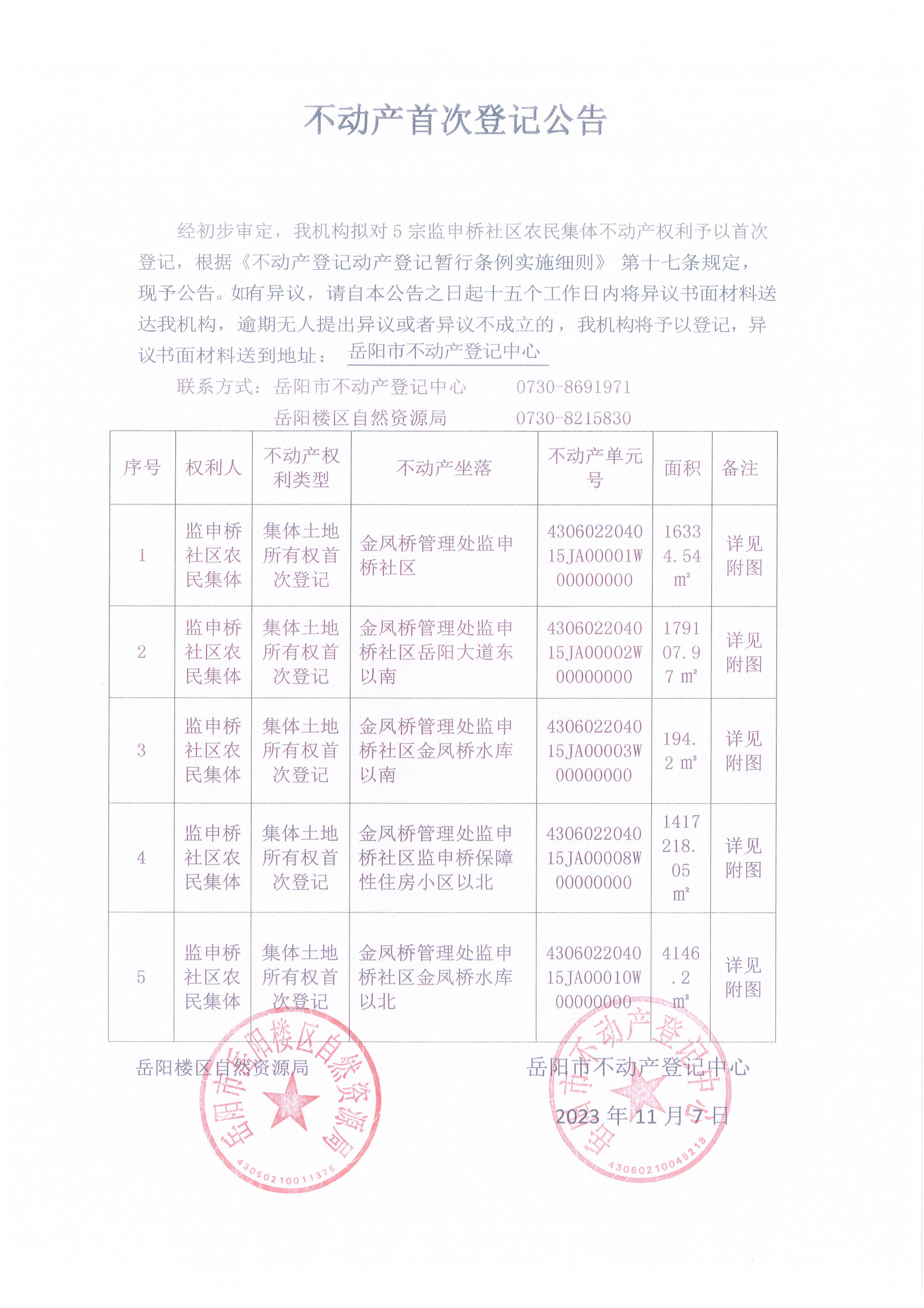 不动产首次登记公告(监申桥社区农民集体)