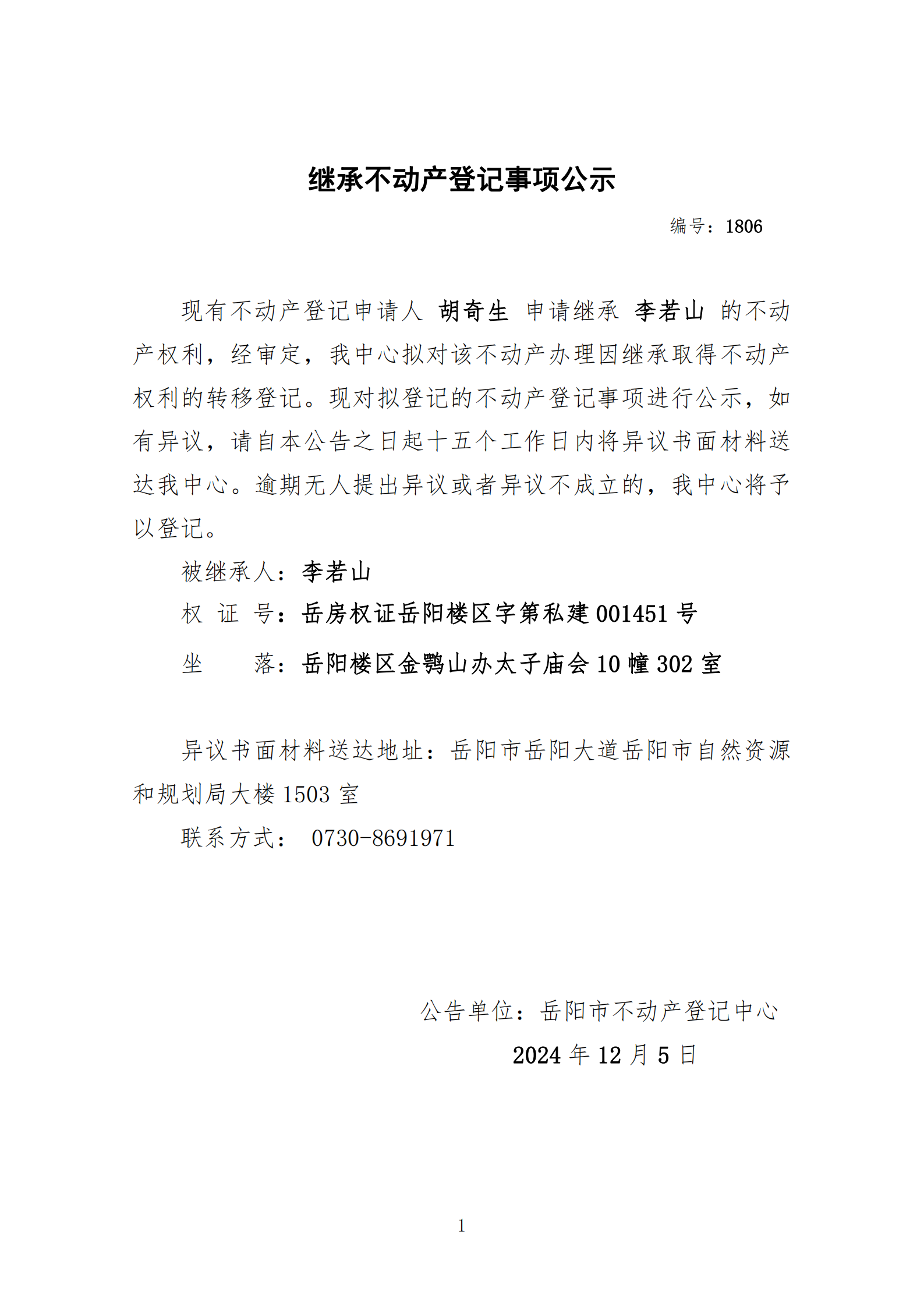 继承不动产登记公示 编号:胡奇生(1806)