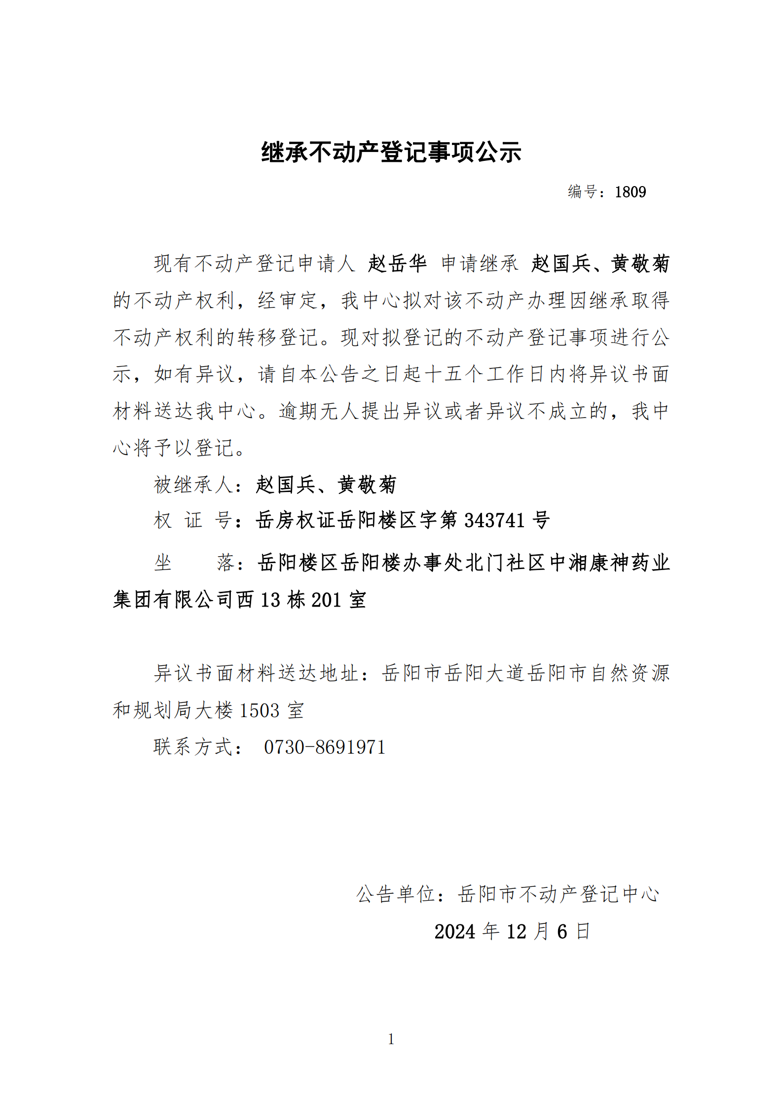 继承不动产登记公示 编号:赵岳华(1809)