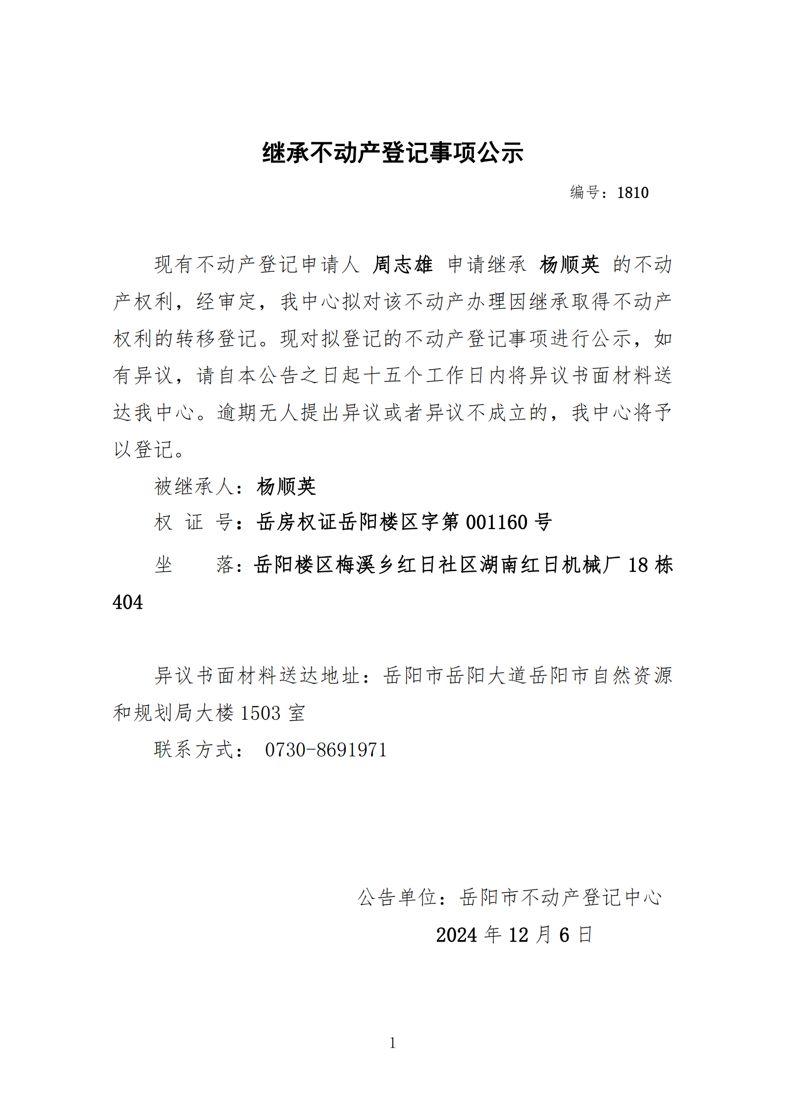继承不动产登记公示 编号:周志雄(1810)