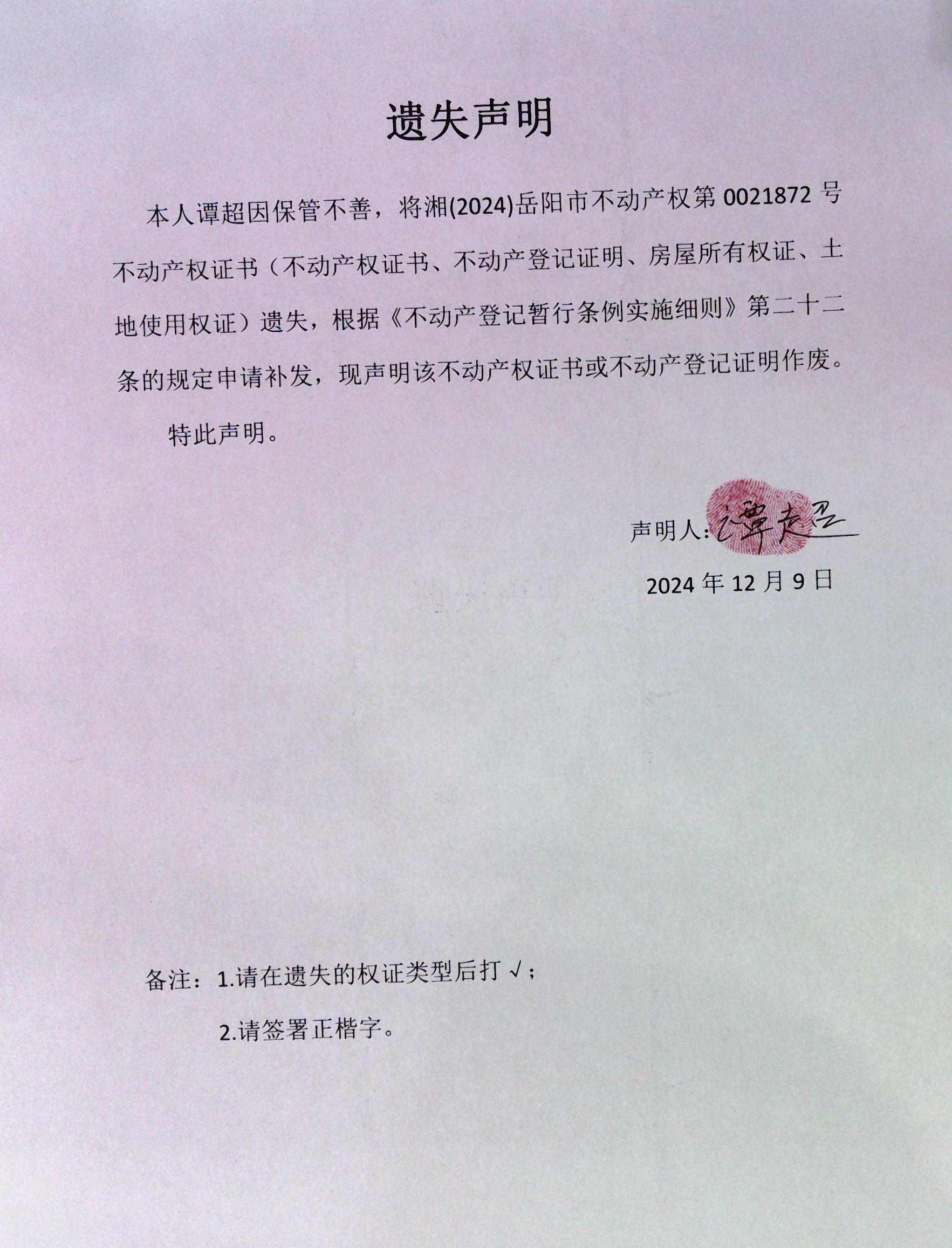 遗失声明( 谭超)