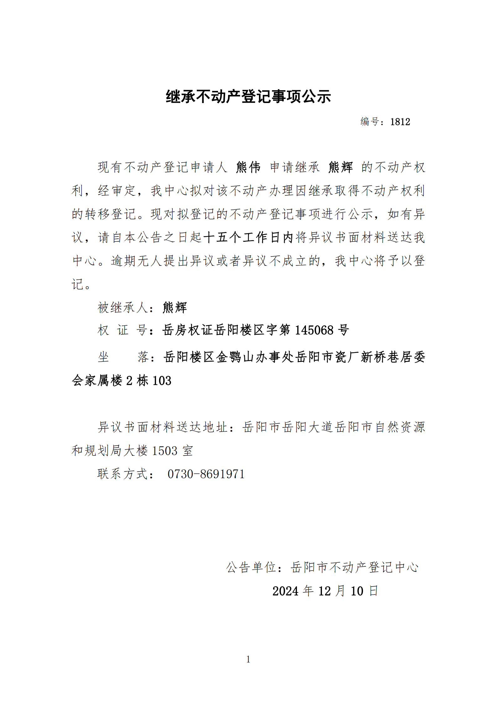 继承不动产登记公示 编号:熊伟(1812)