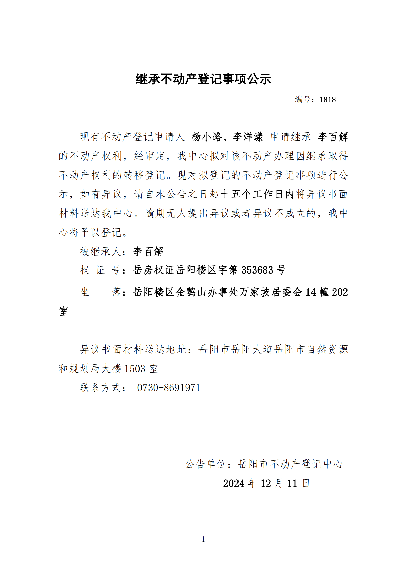 继承不动产登记公示 编号:杨小路、李洋漾(1818)