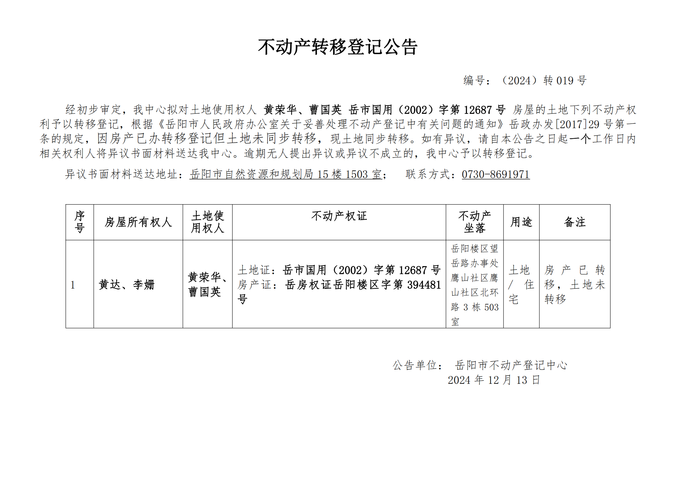 不动产转移登记公告 编号:黄荣华、曹国英(2024)转019