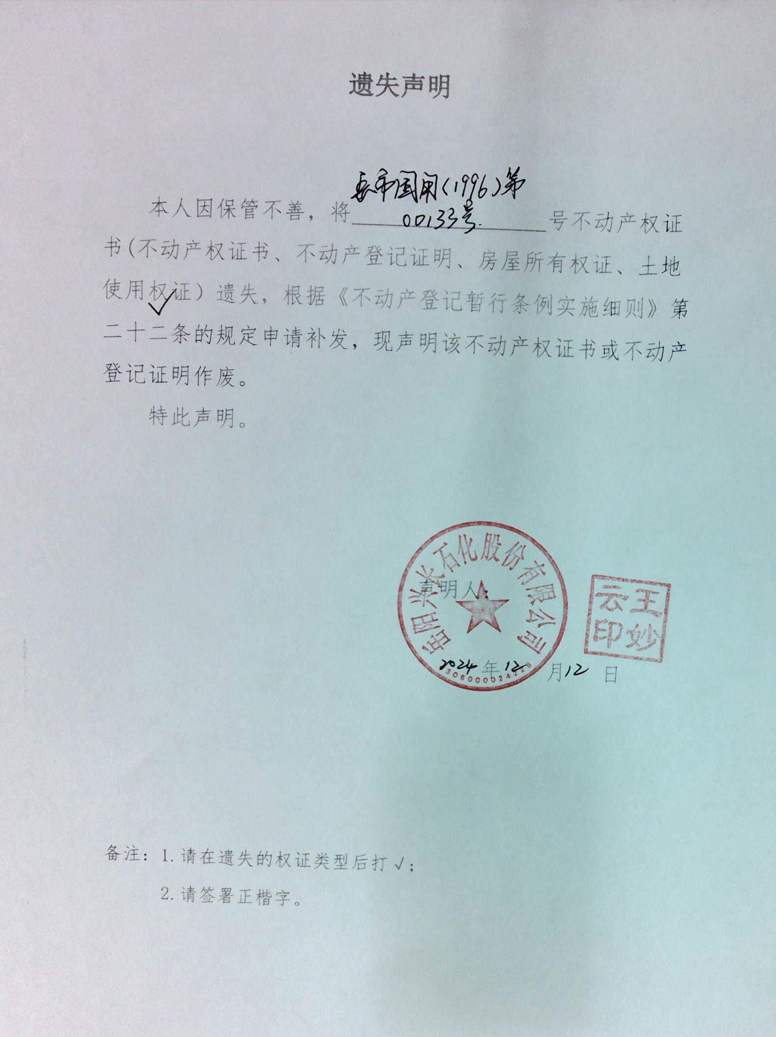 遗失声明(岳阳兴长石化股份有限公司)