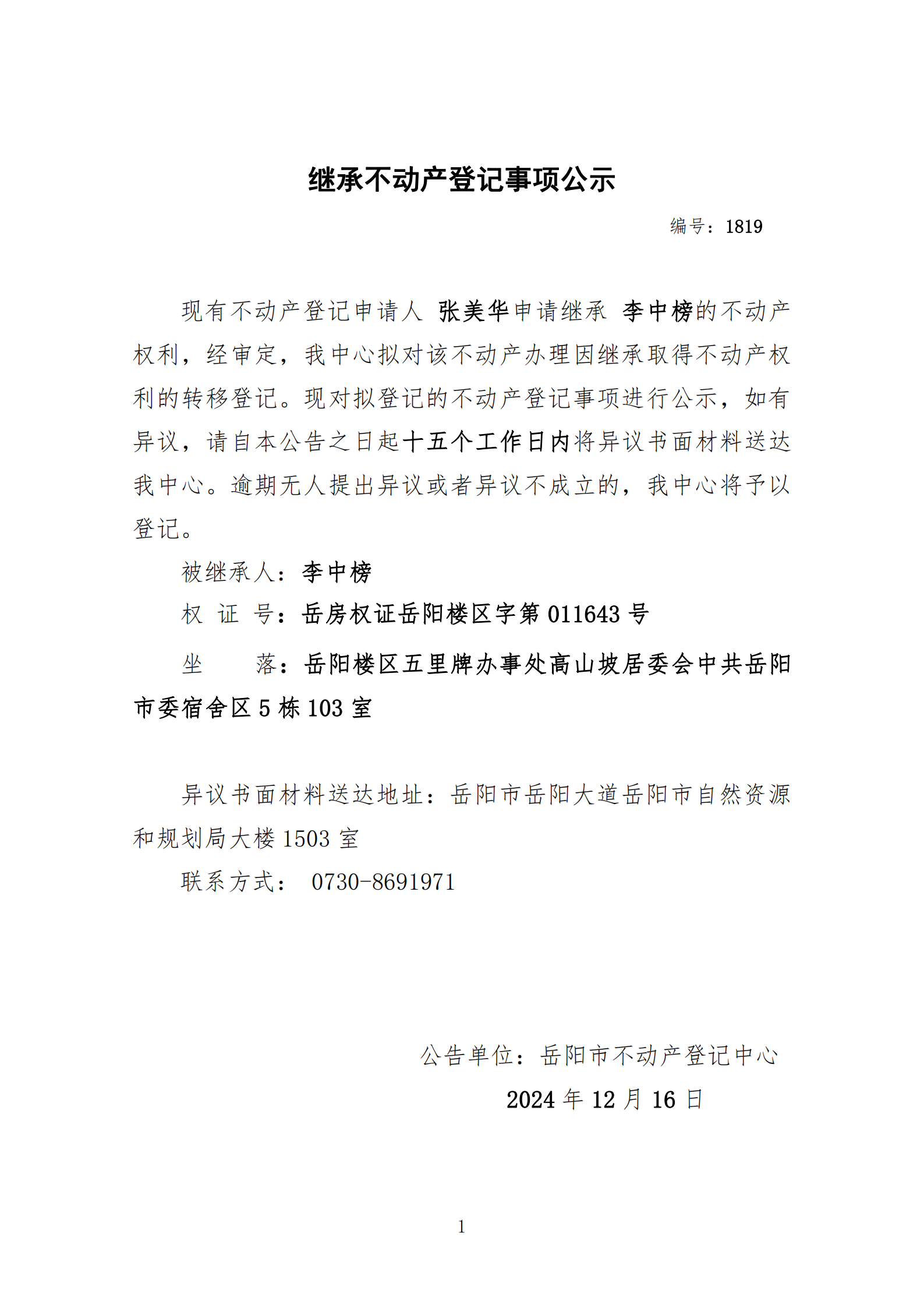 继承不动产登记公示 编号:张美华(1819)