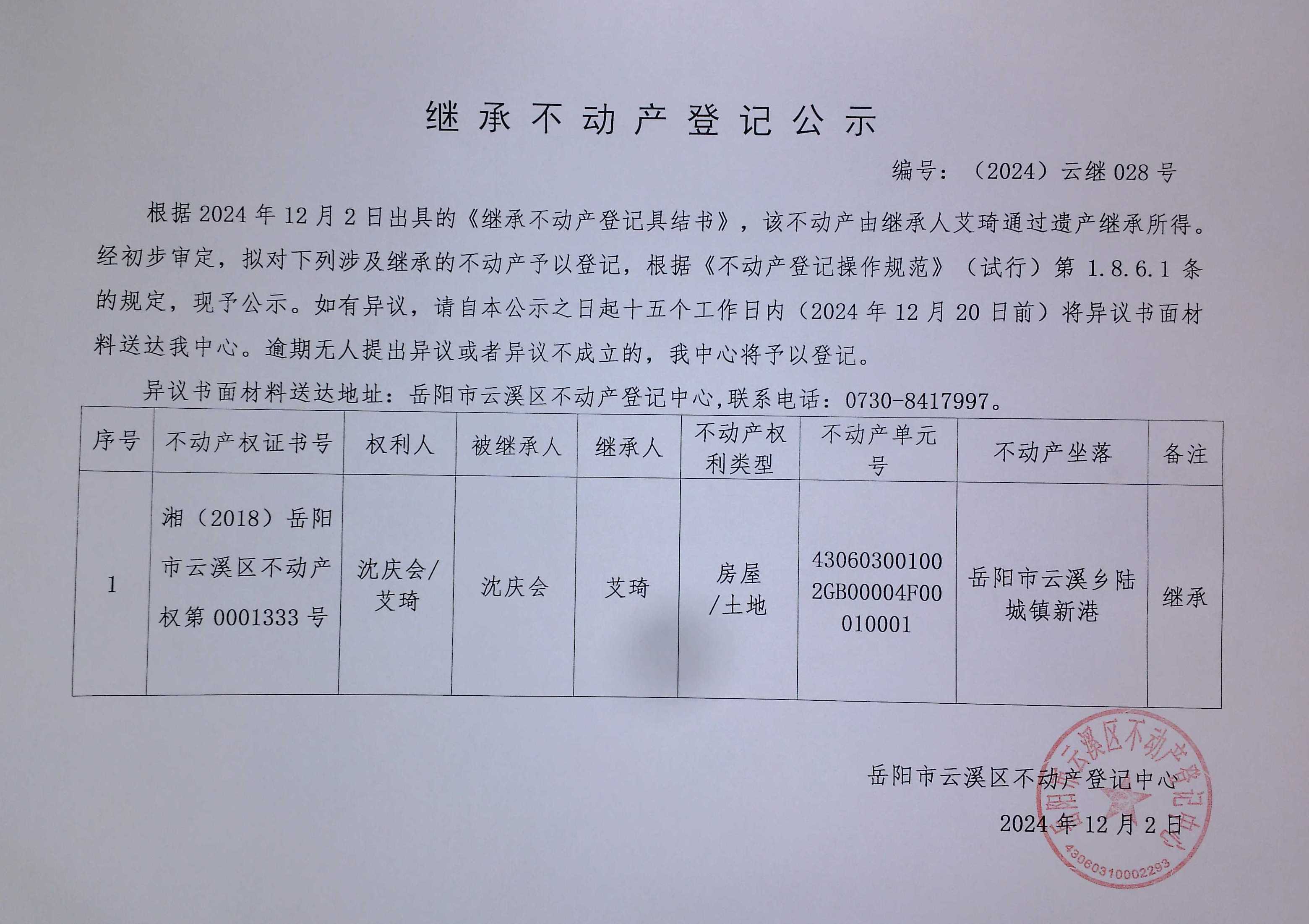 继承不动产登记公示 编号: (2024)云继028号