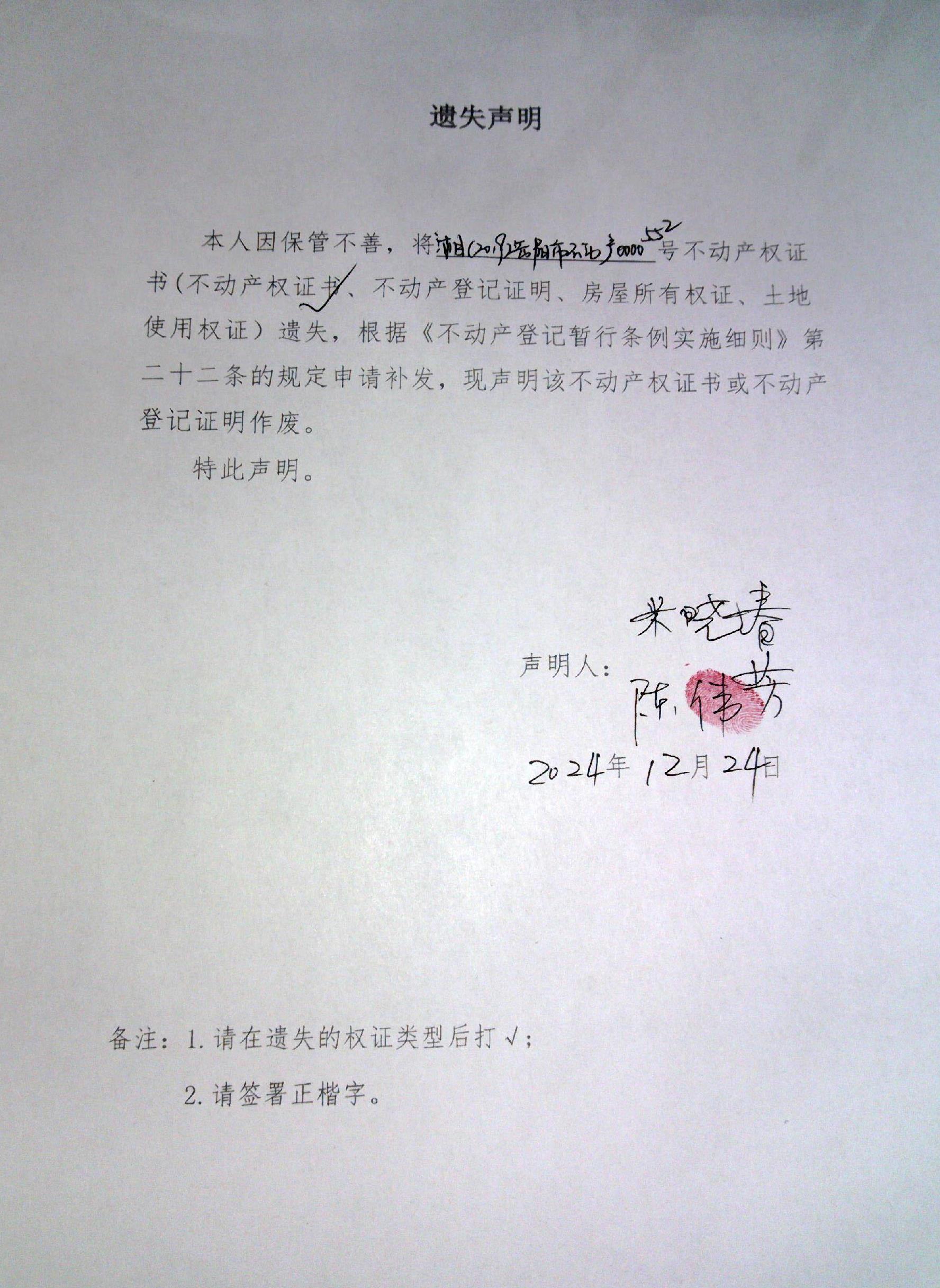 遗失声明(米晓春、陈伟芳)