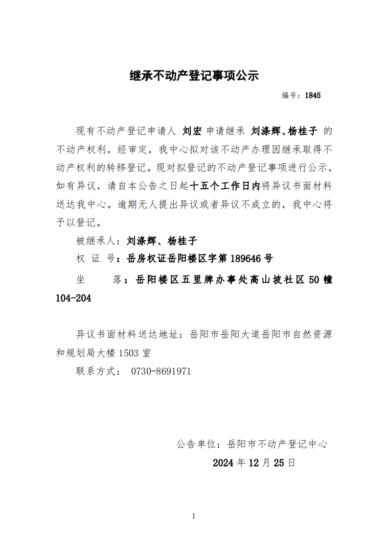 继承不动产登记公示 编号:刘宏(1845)