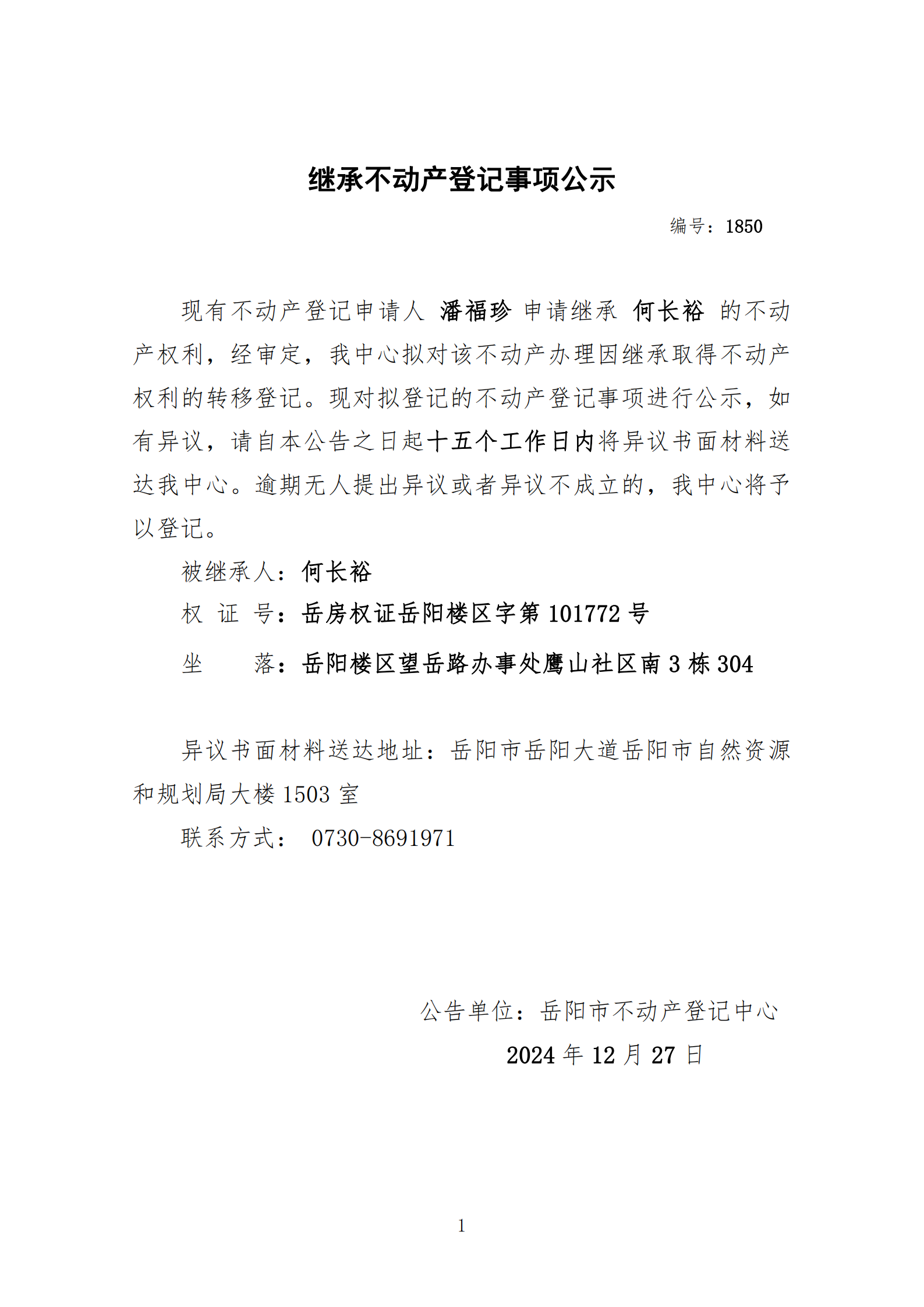 继承不动产登记公示 编号:潘福珍(1850)