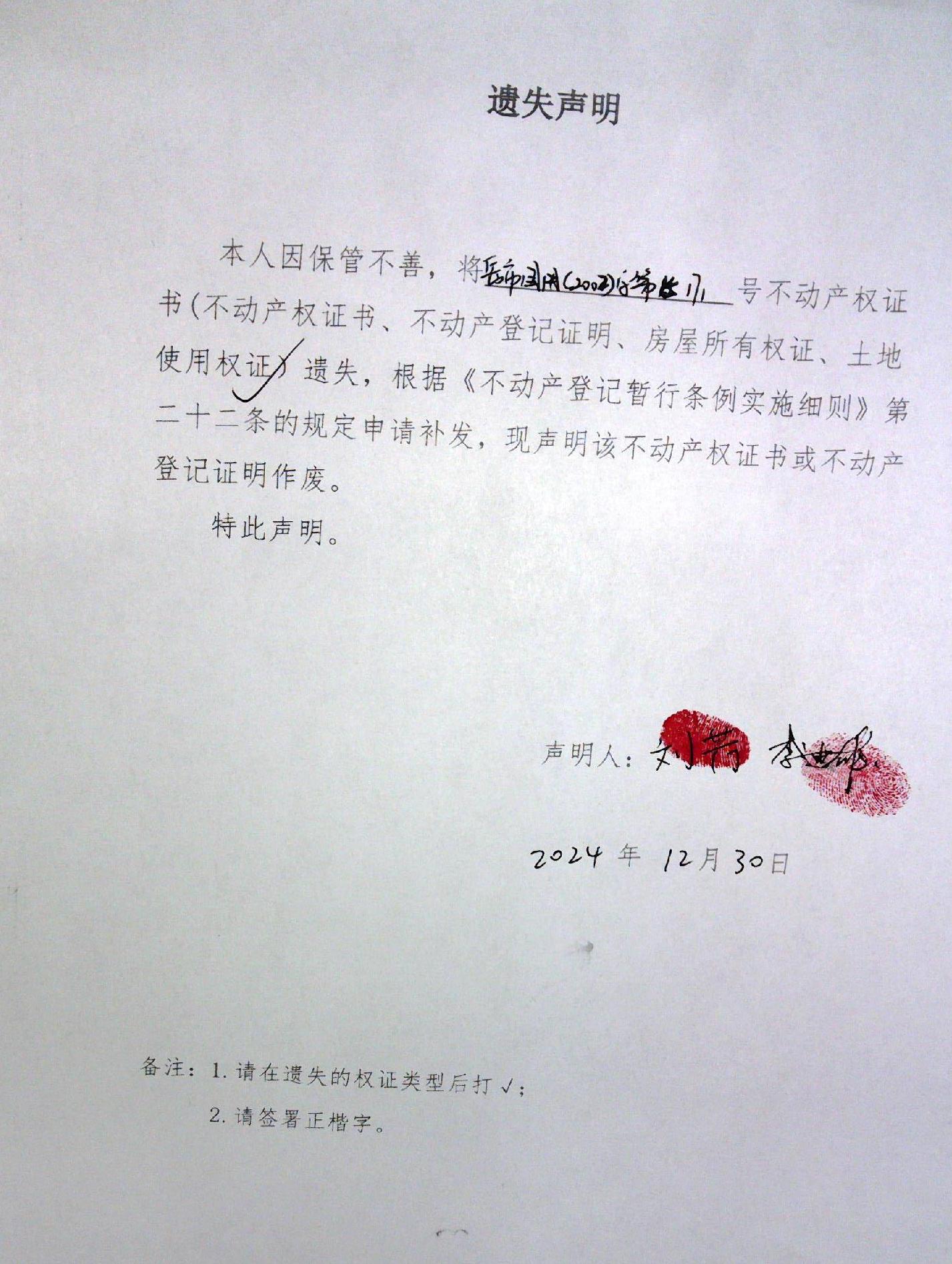 遗失声明(李迪雄、刘芳)
