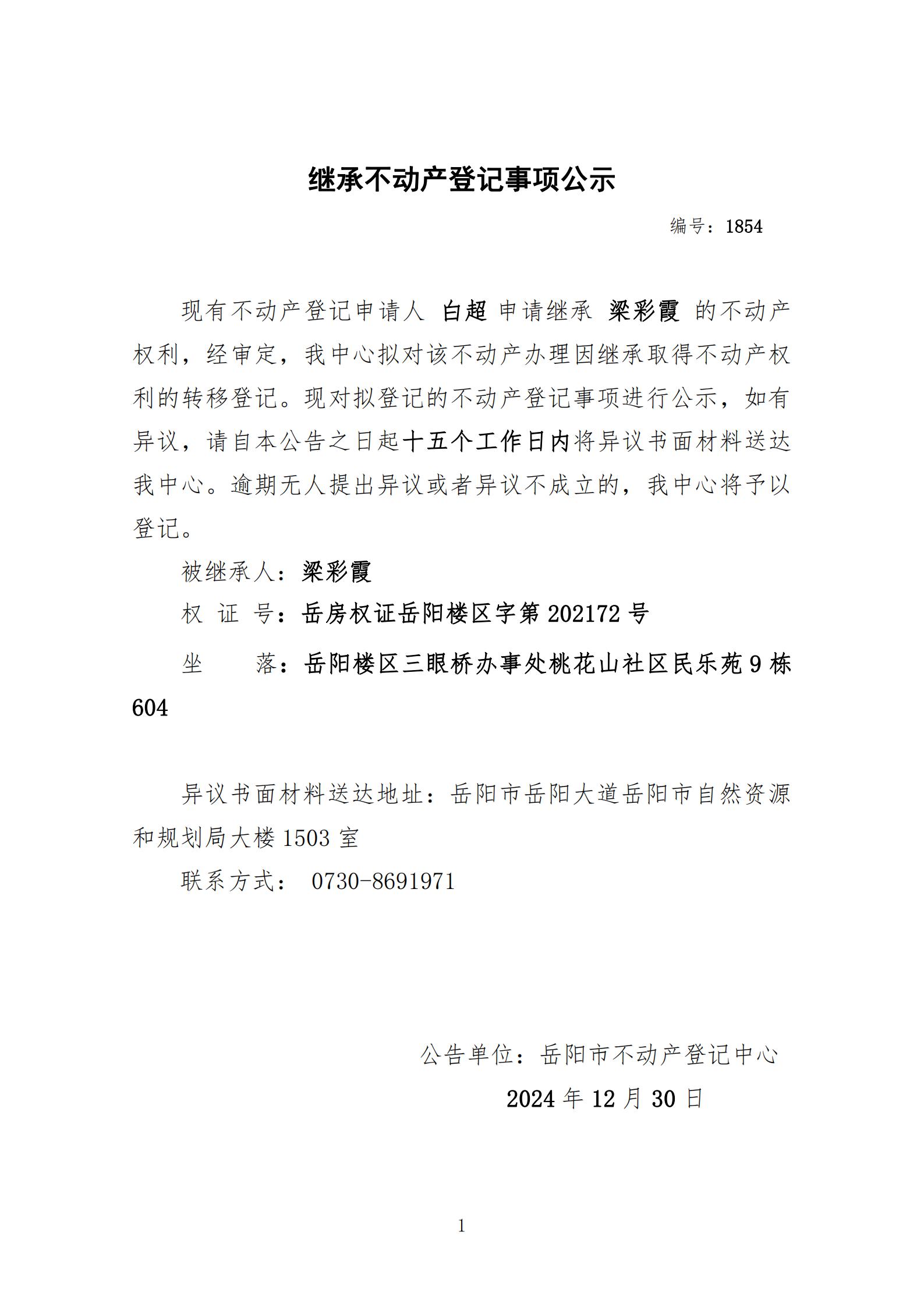 继承不动产登记公示 编号:白超(1854)