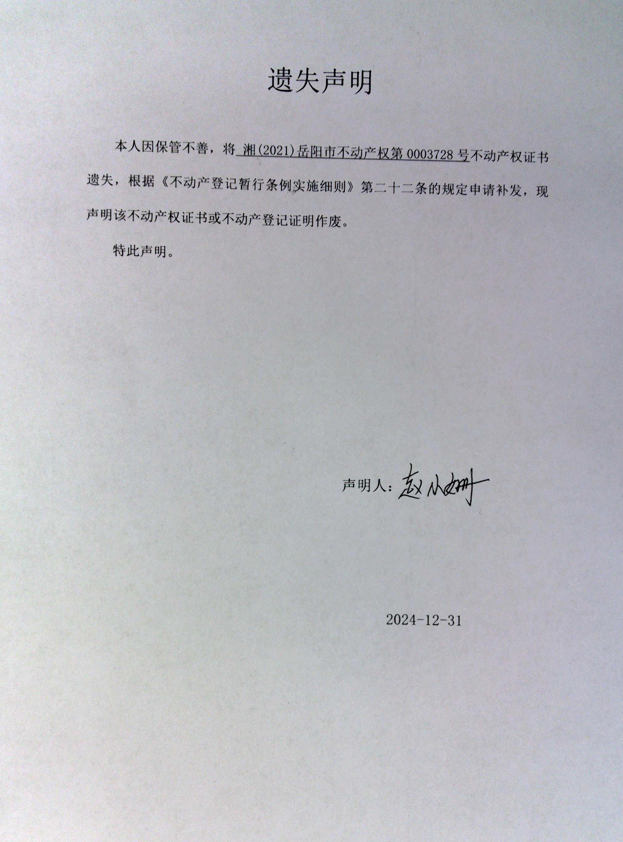 遗失声明(赵小姗 )