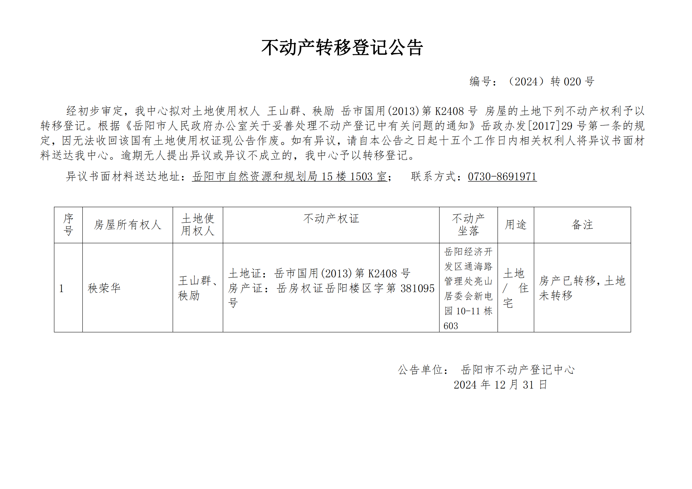 不动产转移登记公告 编号:王山群、秧励(2024)转020