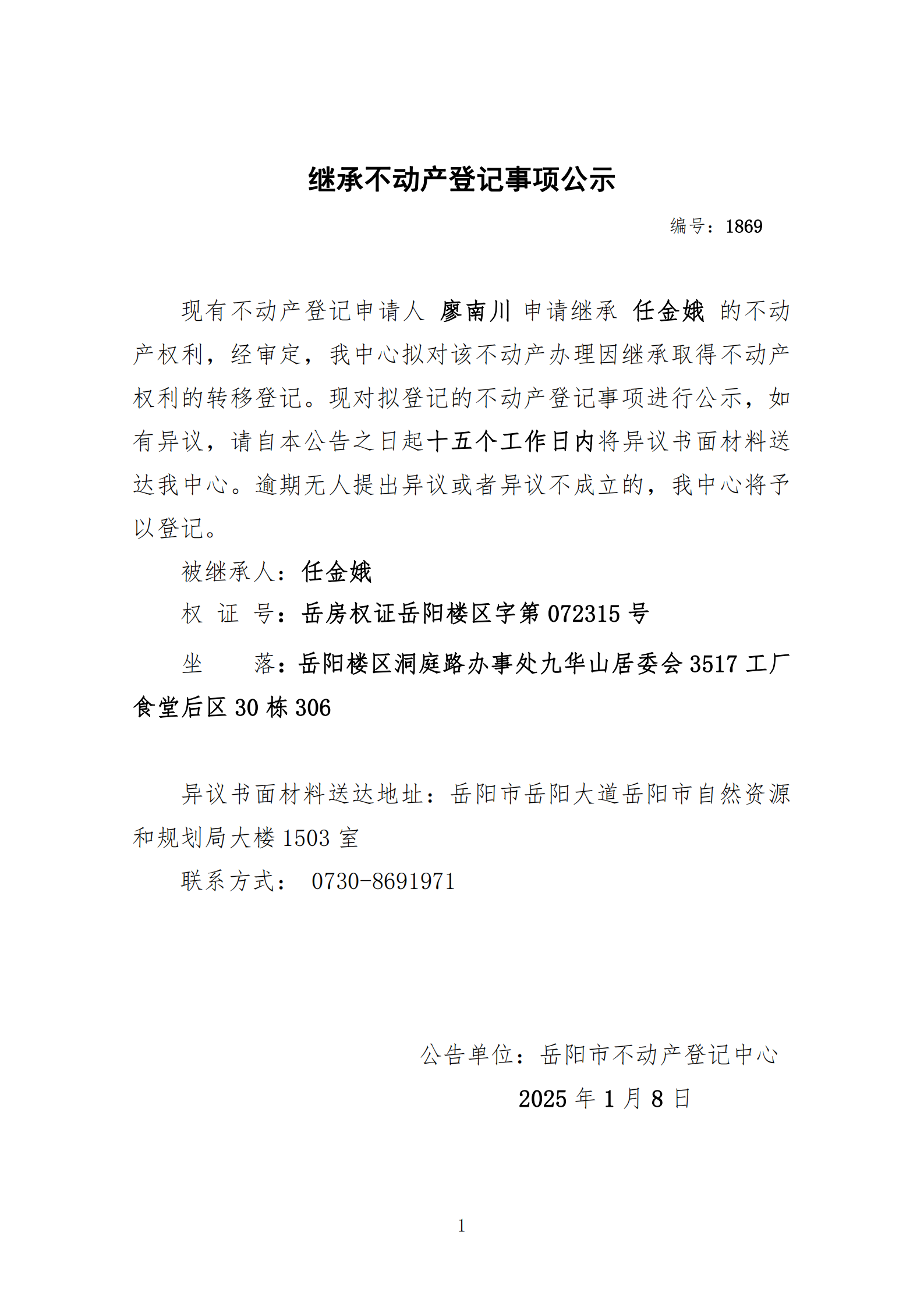 继承不动产登记公示 编号:廖南川(1869)