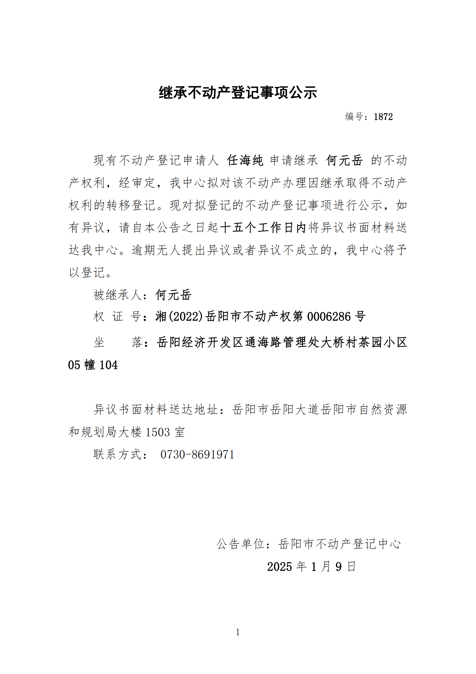 继承不动产登记公示 编号:任海纯(1872)