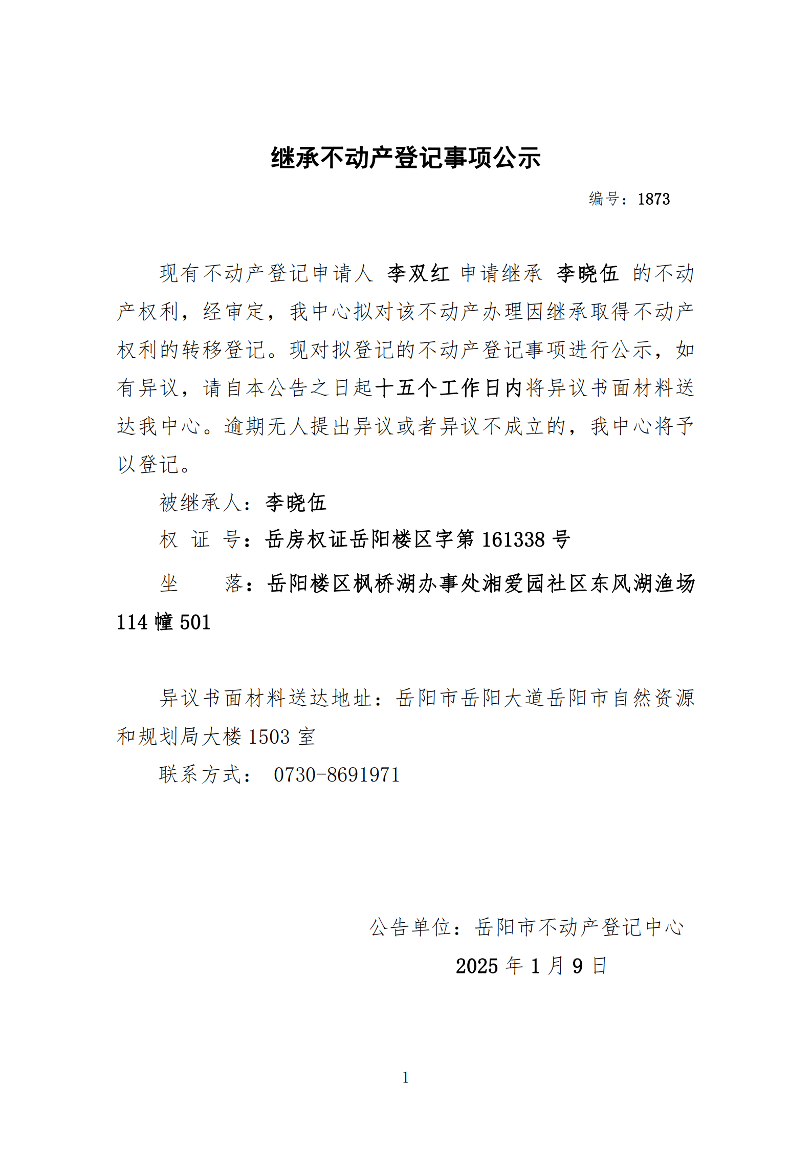 继承不动产登记公示 编号:李双红(1873)