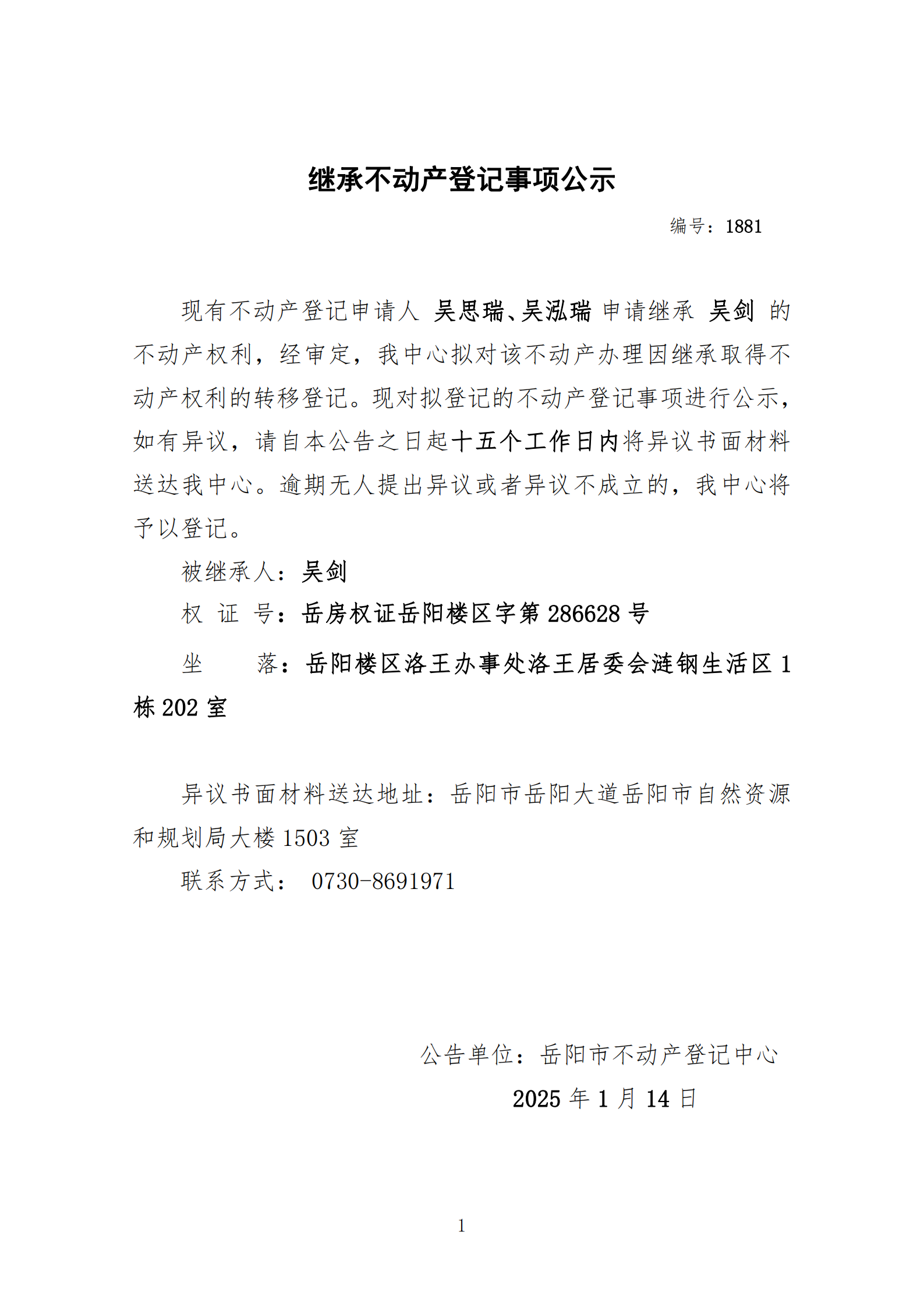 继承不动产登记公示 编号:吴思瑞、吴泓瑞(1881)