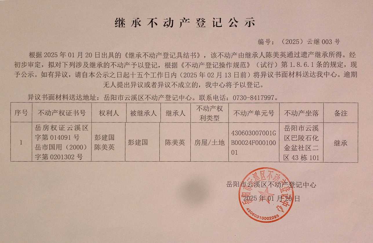 继承不动产登记公示 编号: (2025)云继003号