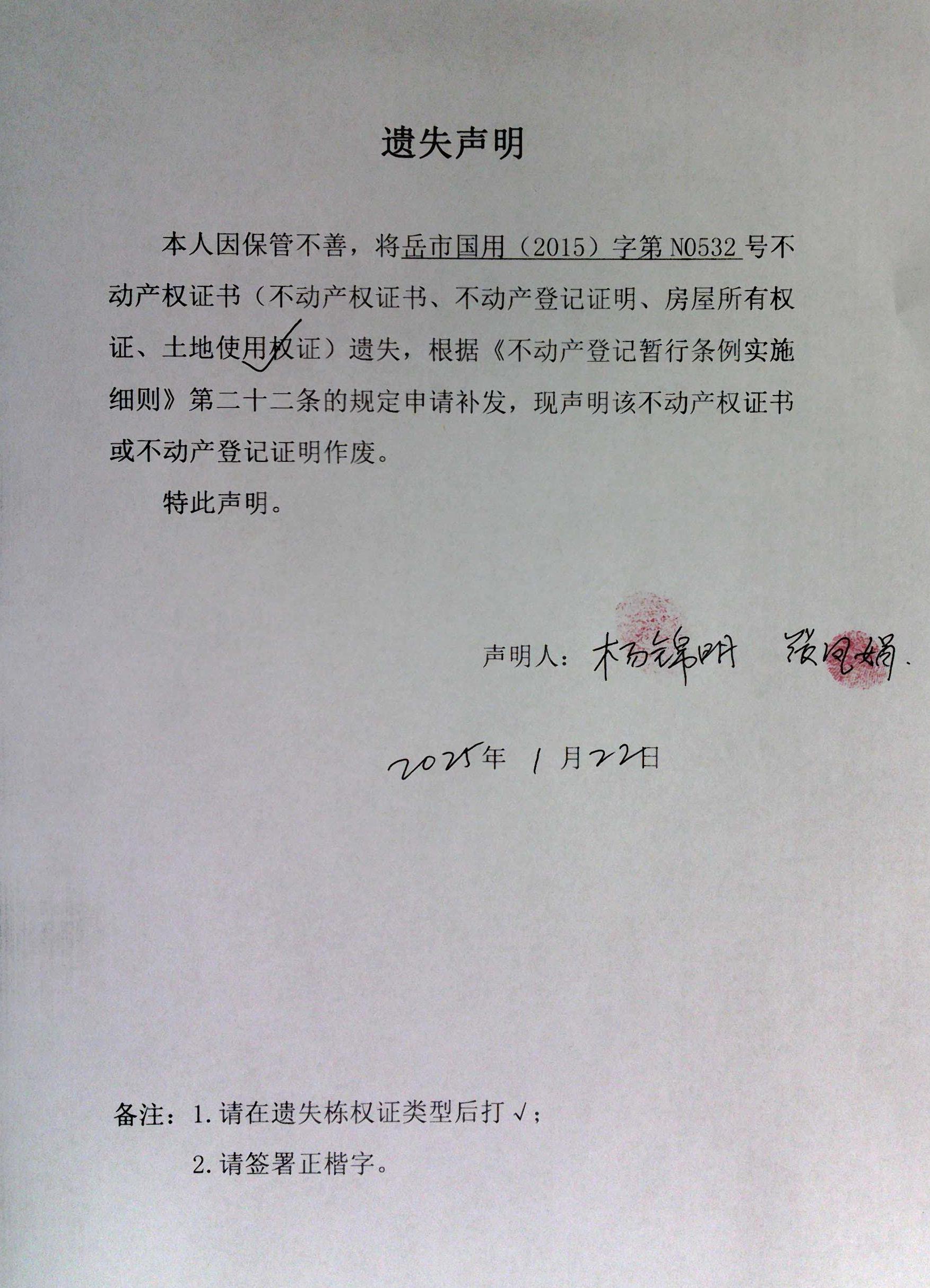 遗失声明(张凤娟、杨锦明)
