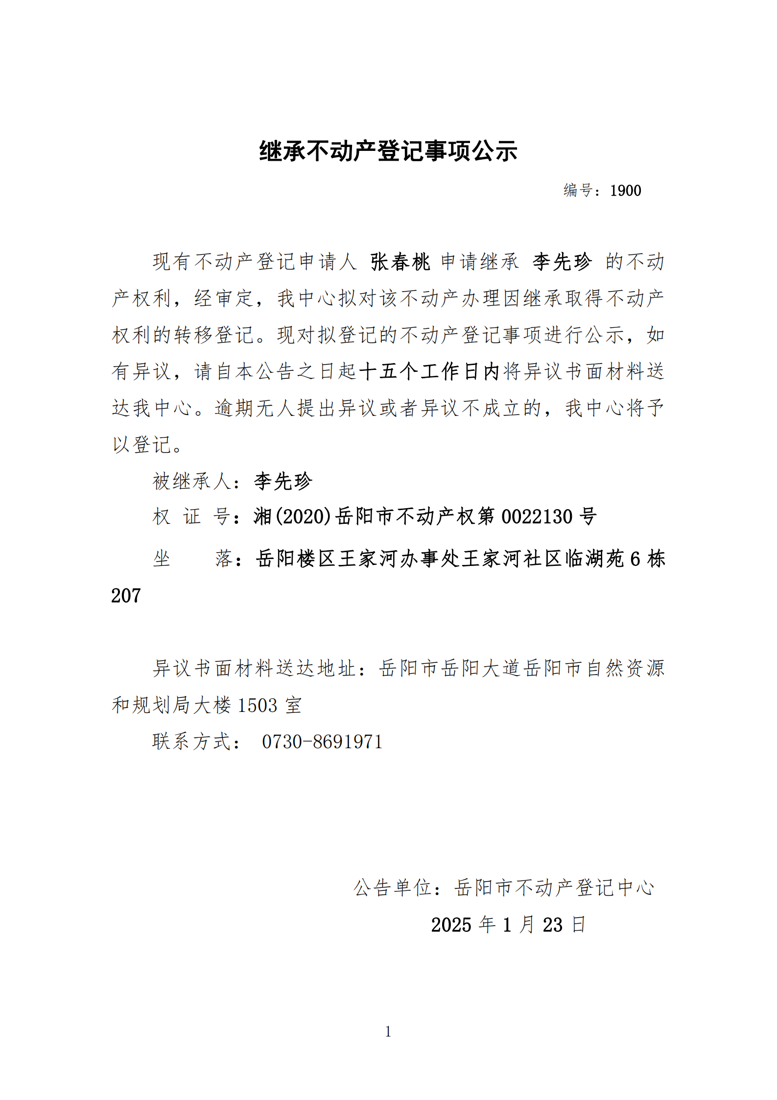 继承不动产登记公示 编号:张春桃(1900)